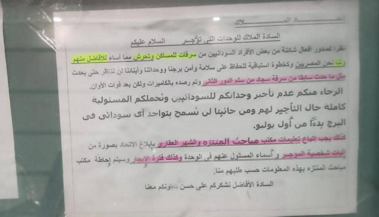 واتهم البيان الذي وضع على مدخل البرج الأسر السودانية بجريمة السرقة والتحرش، مشددا على ضرورة منع الايجار للسودانيين للحفاظ على المبنى والوحدات السكنية والابناء.