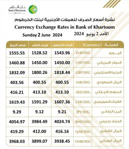 سعر العملات أمام الجنيه السوداني في بنك امدرمان الأحد 2/6/2024