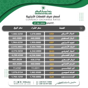 أسعار العملات الصادرة من بنك امدرمان اليوم الخميس 27 يونيو 2024م: