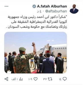 ماذا قال البرهان في تغريده بعد ذهاب أبي احمد ؟ متابعات - النوارس اخبار بواسطة النوارس في يوليو 9, 2024 0 في تغريدة علي منصة إكس – البرهان يشكر القيادة الاثيوبية علي تضامنها مع السودان. وقال سيادته” شكرا دكتور أبي احمد رئيس وزراء جمهورية أثيوبيا الفدرالية الديمقراطية الشقيقة علي زيارتك وتضامنك مع حكومة وشعب السودان” تابعنا على الواتساب لمزيد من الاخبار 0 شارك