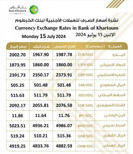 أسعار العملات الصادرة من بنك الخرطوم اليوم الإثنين   15  يوليو 2024م: