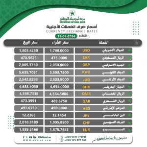 أسعار العملات الصادرة من بنك امدرمان اليوم الثلاثاء 16 يوليو 2024م: