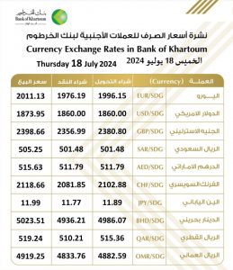 أسعار العملات الصادرة من بنك الخرطوم اليوم الخميس 18 يوليو 2024م: