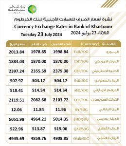 أسعار العملات الصادرة من بنك الخرطوم اليوم الثلاثاء 23 يوليو 2024م: