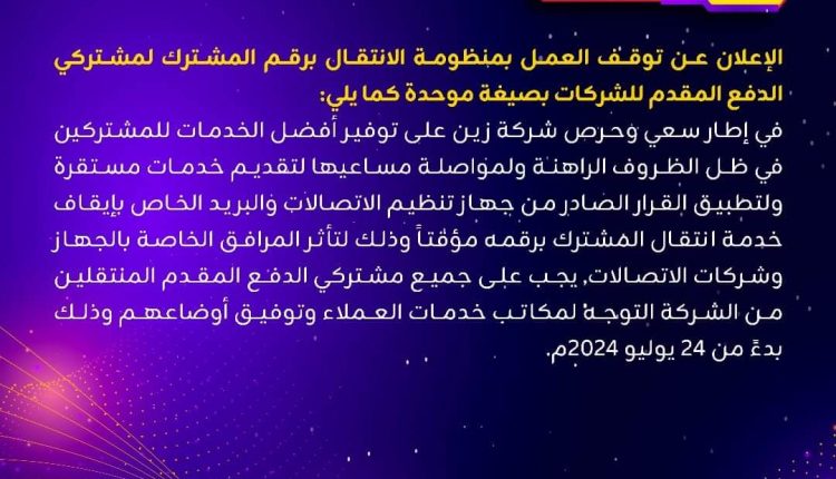 في إطار سعي وحرص شركة زين على توفير أفضل الخدمات للمشتركين في ظل الظروف الراهنة ولمواصلة مساعيها لتقديم خدمات مستقرة ولتطبيق القرار الصادر من جهاز تنظيم الاتصالات والبريد الخاص بإيقاف خدمة انتقال المشترك برقمه مؤقتاً .