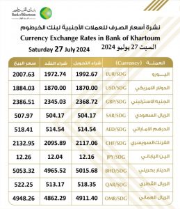 أسعار العملات الصادرة من بنك الخرطوم اليوم السبت 27 يوليو 2024م: