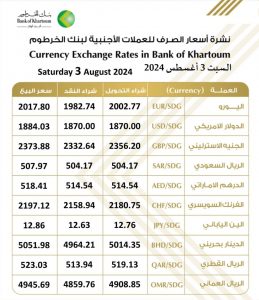 أسعار العملات الصادرة من بنك الخرطوم اليوم السبت 3 أغسطس 2024م: