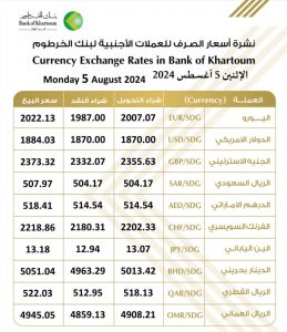 بنك الخرطوم يعلن سعر الجنيه السوداني مقابل الدولار، الريال، الدينار وباقي العملات متابعات - النوارس اقتصاد بواسطة النوارس في أغسطس 5, 2024 أسعار العملات الصادرة من بنك الخرطوم اليوم الإثنين 5 أغسطس 2024م: الجنيه السوداني واجه ترنحاً قوياً بين باقي العملات منذ بدء حرب أبريل 2023م مما ادي الي تفاقم الاوضاع في البلاد. تابعنا على الواتساب لمزيد من الاخبار شارك