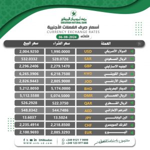 أسعار العملات الصادرة من بنك امدرمان اليوم الثلاثاء 6 أغسطس 2024م: