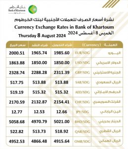 بنك الخرطوم ينشر سعر الجنيه السوداني مقابل الدولار، الدينار وباقي العملات متابعات - النوارس اقتصاد بواسطة النوارس في أغسطس 8, 2024 أسعار العملات الصادرة من بنك الخرطوم اليوم الخميس 8 أغسطس 2024م: الجنيه السوداني واجه ترنحاً قوياً بين باقي العملات منذ بدء حرب أبريل 2023م مما ادي الي تفاقم الاوضاع في البلاد. تابعنا على الواتساب لمزيد من الاخبار شارك