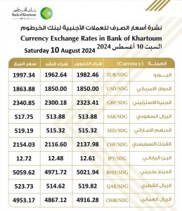 أسعار العملات الصادرة من بنك الخرطوم اليوم السبت 10 أغسطس 2024م: