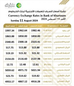 أسعار العملات الصادرة من بنك الخرطوم اليوم الأحد 11 أغسطس 2024م: