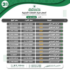 أسعار العملات الصادرة من بنك امدرمان اليوم الأحد 18 أغسطس 2024م:
