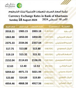 أسعار العملات الصادرة من بنك الخرطوم اليوم الأحد   18   أغسطس 2024م: