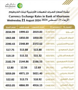 أسعار العملات الصادرة من بنك الخرطوم اليوم الأربعاء 21 أغسطس 2024م:
