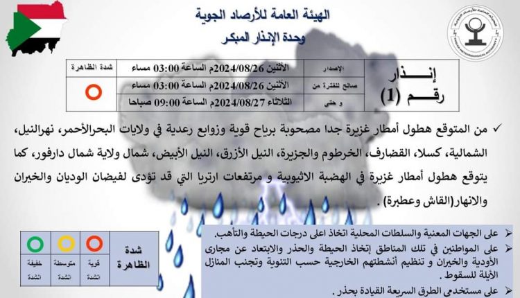 متابعات – النوارس – الهيئة العامة للارصاد الجوية – وحدة الإنذار المبكر تحذر من أمطار غزيرة جداً وسيول بعشر ولايات وفيضانات بنهري القاش وعطبرة.