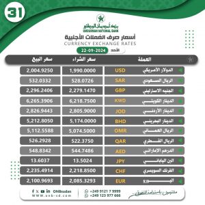 أسعار العملات الصادرة من بنك امدرمان اليوم الأحد 22 سبتمبر 2024م: