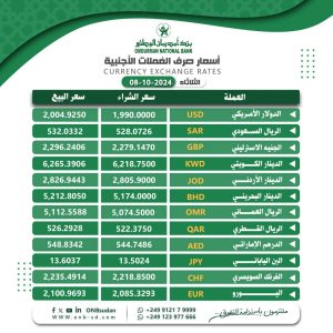 أسعار العملات الصادرة من بنك امدرمان اليوم الثلاثاء      8   إكتوبر   2024م: