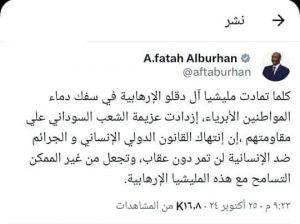 بعد المجـ..ـازر عبدالفتاح البرهان يقول (…) متابعات - النوارس اخبار بواسطة النوارس في أكتوبر 25, 2024 عاجل متابعات – النوارس – بعد إستباحة قري ولاية الجزيرة والمجـ..ـازر التي نفذتها ميليشيات الدعم السريع . نشر القائد العام عبدالفتاح البرهان. كلما تمادت مليشيا آل دقلو الإرهـ..ـابية ازدادت عزيمة الشعب السوداني . تابعنا على الواتساب لمزيد من الاخبار شارك