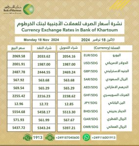أسعار العملات الصادرة من بنك الخرطوم اليوم الإثنين 18 نوفمبر 2024م: