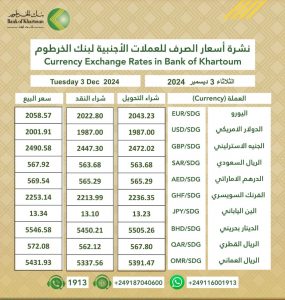 أسعار العملات الصادرة من بنك الخرطوم اليوم الثلاثاء  3  ديسمبر   2024م: