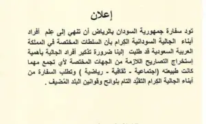 وشددت السفارة على أهمية التزام أبناء الجالية السودانية بالقوانين واللوائح المعمول بها في المملكة العربية السعودية، مع ضرورة احترام القواعد المنظمة للحياة في البلد المضيف.