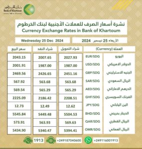 أسعار العملات الصادرة من بنك الخرطوم اليوم  الأربعاء   25 ديسمبر   2024م: