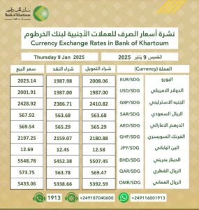 أسعار العملات الصادرة من بنك الخرطوم اليوم  الخميس  9 يناير  2025م