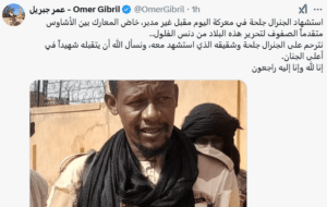 متابعات – النوارس – أعلن عمر جبريل عن مقتل الجنرال جلحة رحمة مهدي خلال مشاركته في معركة بالخرطوم، حيث وصفه بأنه كان يقاتل في مقدمة الصفوف بين جنوده الأشاوس، مؤكدًا التزامه بتحرير البلاد من النزاعات والصراعات التي تواجهها.