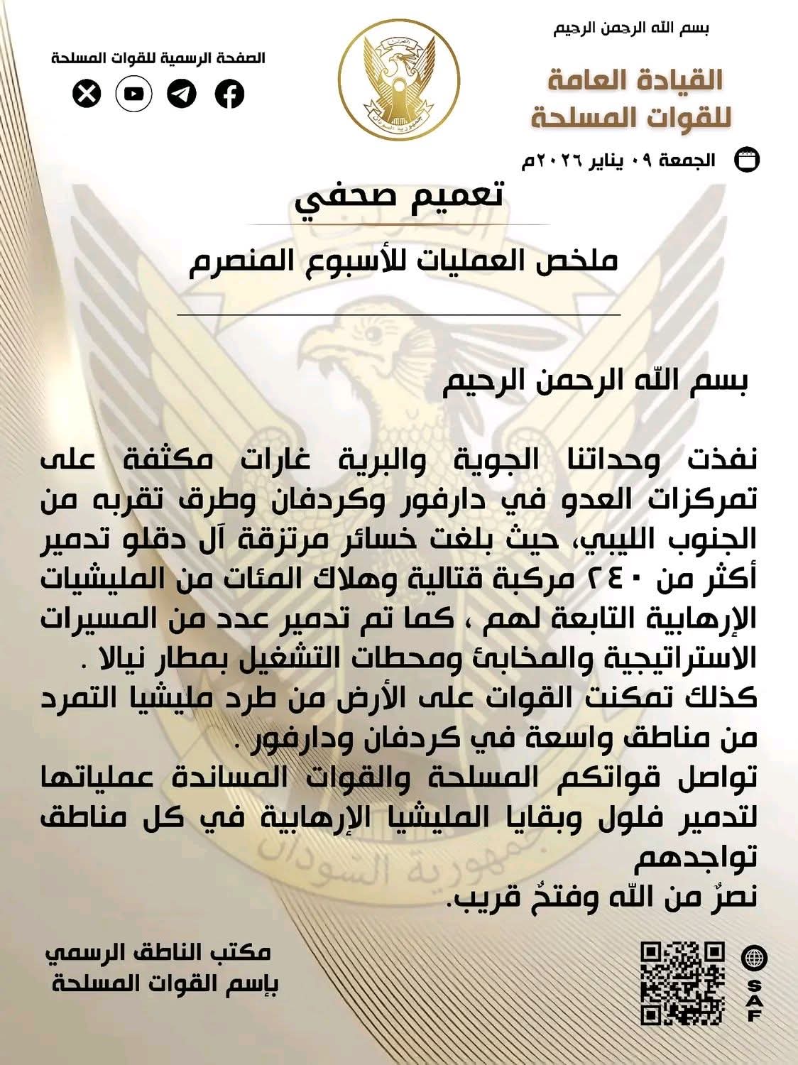 وأكد التعميم الصادر عن القيادة العامة للقوات المسلحة أن العمليات شملت غارات جوية وبرية مكثفة، تدمير مسيرات استراتيجية، ومخابئ ومحطات تشغيل بمطار نيالا، فيما تمكنت القوات البرية من طرد المليشيات من مناطق واسعة، واستعادة السيطرة على نقاط حيوية في المنطقة.