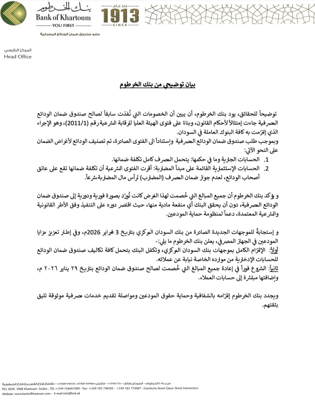 وأكد بنك الخرطوم أن جميع المبالغ المخصومة كانت تُورّد بشكل فوري ودوري إلى صندوق ضمان الودائع المصرفية، دون أن يحقق منها أي منفعة مالية، مشددًا على أن دوره اقتصر على التنفيذ في إطار قانوني وشرعي معتمد، دعمًا لمنظومة الاستقرار المالي وحماية حقوق المودعين.