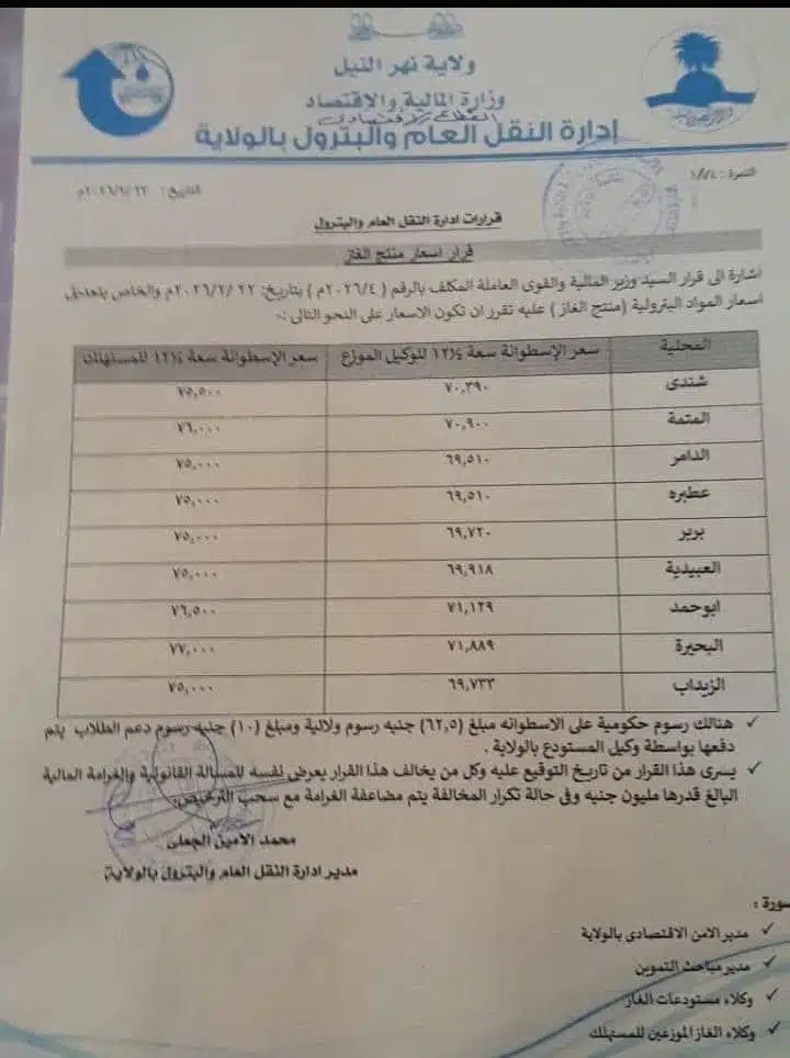 وحدد القرار سعر الأسطوانة عند 75 ألف جنيه في محليات شندي، الدامر، عطبرة، العبيدية، بربر والزيداب.