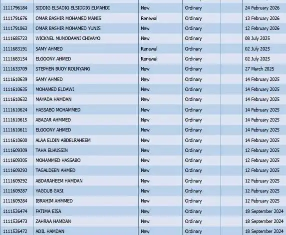 وتضمنت القائمة التي نشرها أسماء قال إنها من بين أبرز الحاصلين على الجوازات، من بينهم: شريف محمد عثمان شريف، طه عثمان إسحاق آدم، صديق الصادق المهدي، عمر بشير محمد مانيس، سامي أحمد، القوني موسى، ميادة حمدان، عبد الرحيم حمدان، وآخرون.